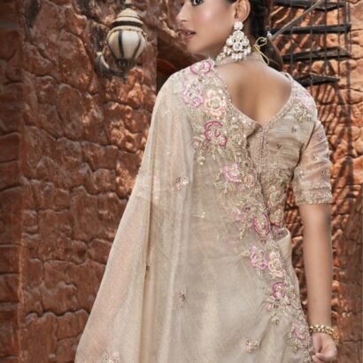 Beige Silk Hand Embroidered Stone And Beads Work Saree Wedding Sarees