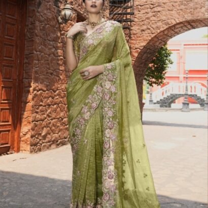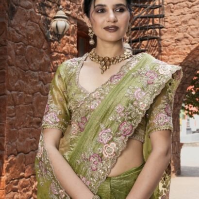 Olive Green Silk Hand Embroidered Stone And Beads Work Saree Wedding Wear