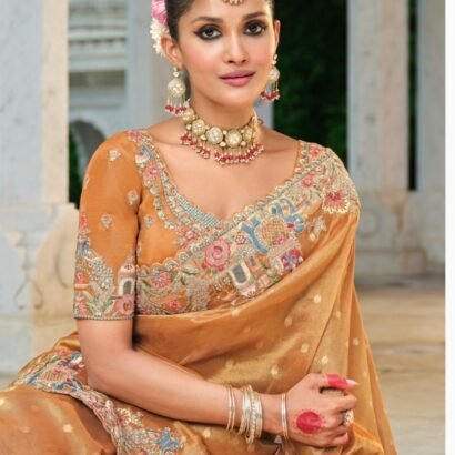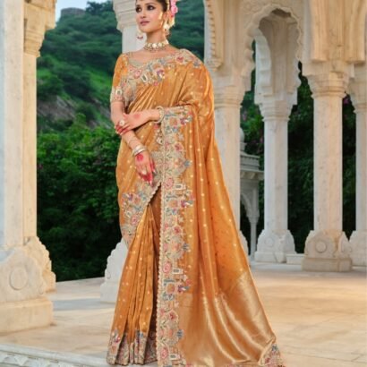 Orange Colour Tissue Zari Saree with Olive Green Embroidered Border & Silk Blouse
