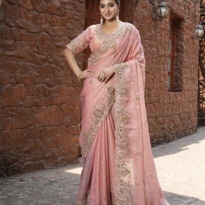Pastel Pink Colour Silk Hand Embroidered Stone And Beads Work Saree Wedding Wear