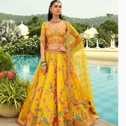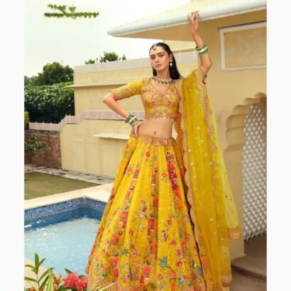 Yellow Floral Embroidered Bridal Lehenga with Embroidered Bridal Lehenga thread work lehenga set